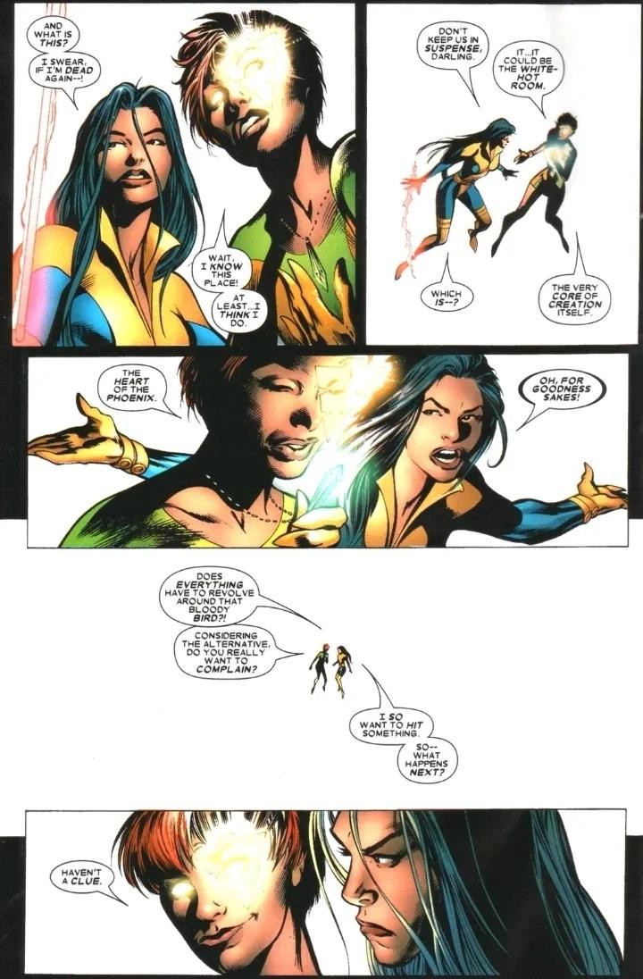 House of M时期,凤凰将女儿瑞秋和其好友灵蝶传送到白热室,躲避绯红女巫的现实修改。