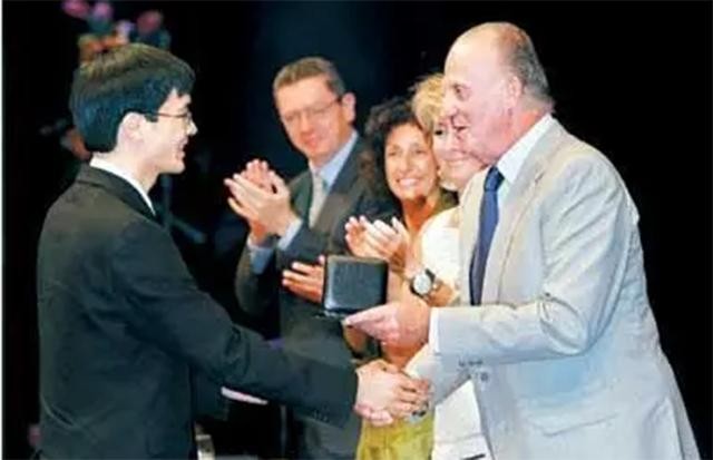 到了颁奖环节,大会一共公布了四位数学家获得菲尔兹奖,而陶哲轩的名字赫然在列。陶哲轩因为对偏微分方程、组合数学、谐波分析和堆垒数论的贡献,西班牙国王卡洛斯一世亲自为他颁奖。
