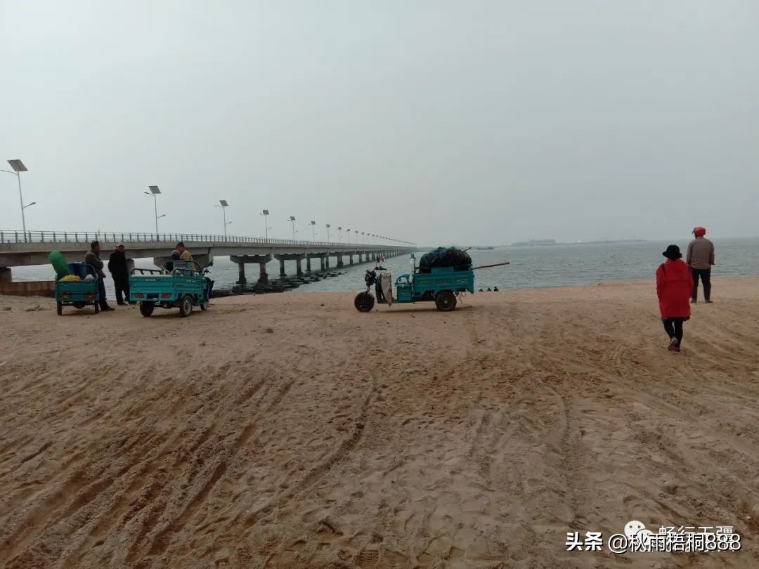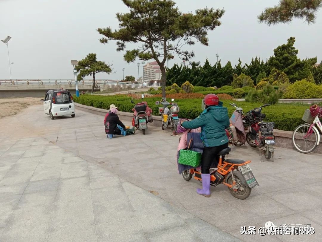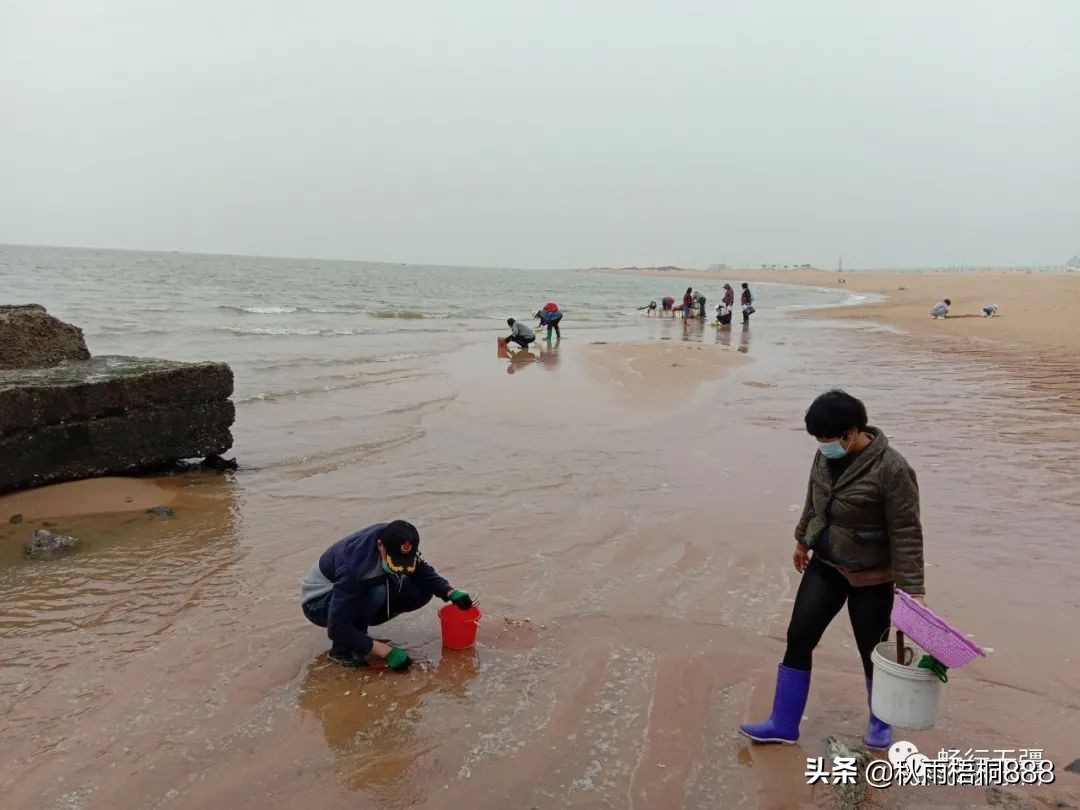 咦,看到海滩上有不少市民,穿着胶鞋,手拿工具,岸边的电动车还有篮子和筐,他们是干什么呢?