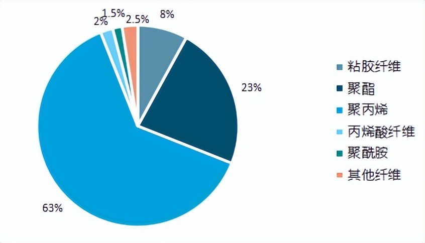 其中,“布”字可能会让人以为其原材料为天然材质,但实际上,用于生产无纺布的三大纤维为聚丙烯(占总数的63%)、聚酯(占总数的23%)和粘胶纤维(占总数的8%),剩余2%为丙烯酸纤维、1.5%为聚酰胺、2.5%为其他纤维[2]。