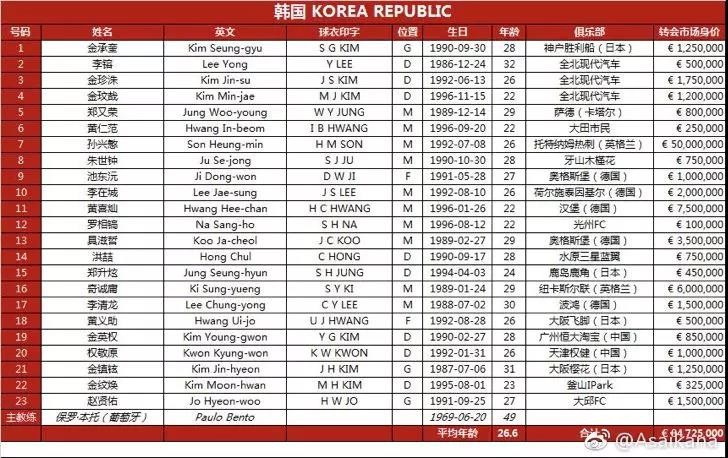 韩国队大名单与转会市场身价(制图:德转中国管理员朱艺)