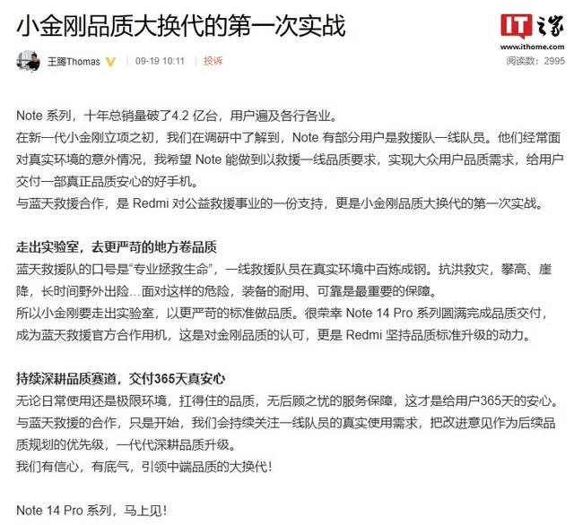 王腾称:“与蓝天救援合作,是 Redmi 对公益救援事业的一份支持,更是小金刚品质大换代的第一次实战”。他还补充道:“很荣幸 Note 14 Pro 系列圆满完成品质交付,成为蓝天救援官方合作用机,这是对金刚品质的认可,更是 Redmi 坚持品质标准升级的动力。”