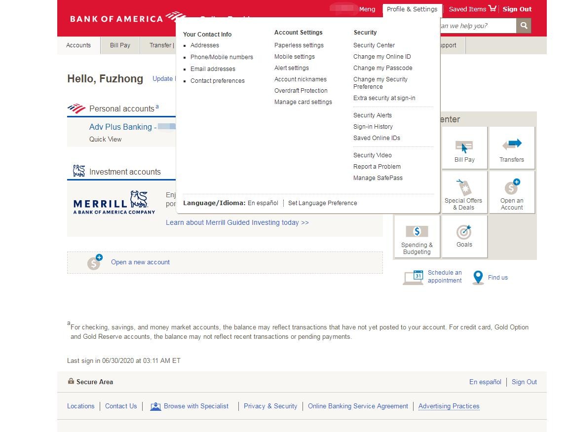 登陆成功后,上面就是网银页面, Personal accounts里面就是你的所有账户,分别是 Checking account支票账户,Savings accountt储蓄账户, Credit card account信用卡账户。如果没有开通的话是没有Savings accountt储蓄账户, Credit card account信用卡账户的。