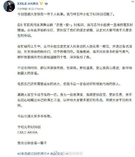 林志玲微博发文宣布结婚,对方是日本男子组合EXILE成员