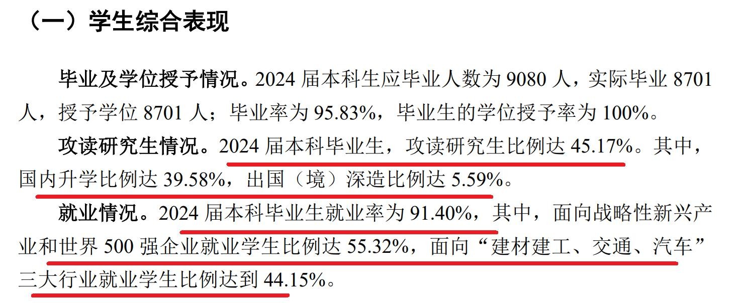 2024届本科生就业率91.4%,其中升学深造率45.17%。本科毕业生入职新兴产业和世界500强企业比例高,建材建工、交通、汽车行业是主要就业方向。
