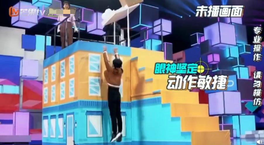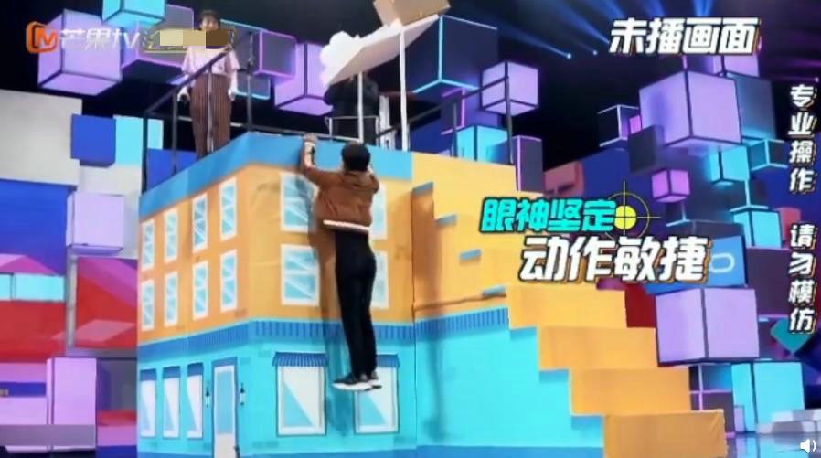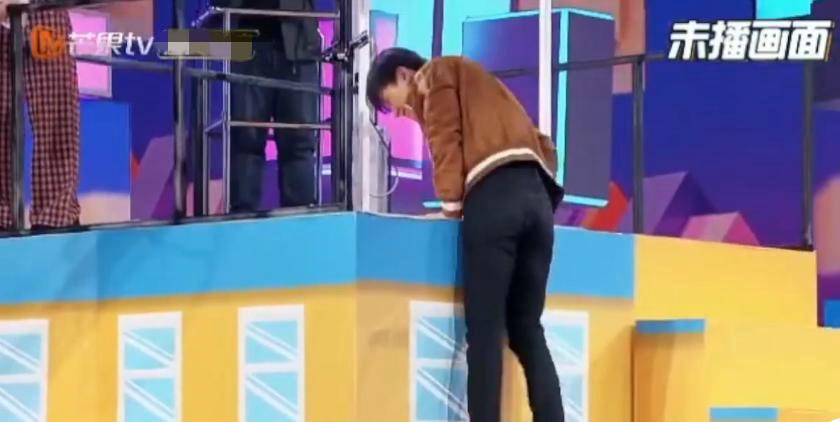 当时节目组安排了一个游戏,需要易烊千玺上到一个大约2.5米到3米高舞台上,用棉花糖哄吴昕开心。
