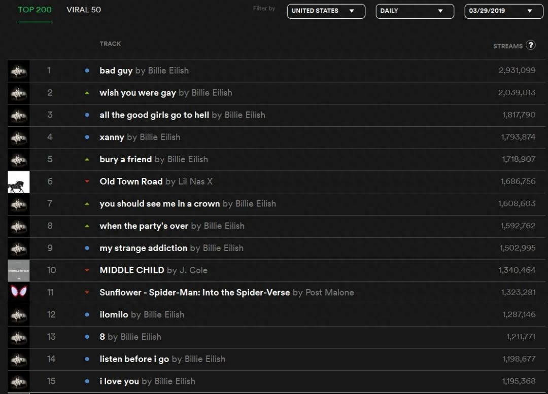 她的首张专辑《WHEN WE ALL FALL ASLEEP,WHERE DO WE GO?》一发行就成绩惊人14首歌,12首洗榜Spotify美区单日榜Top 15,前5全是她的。