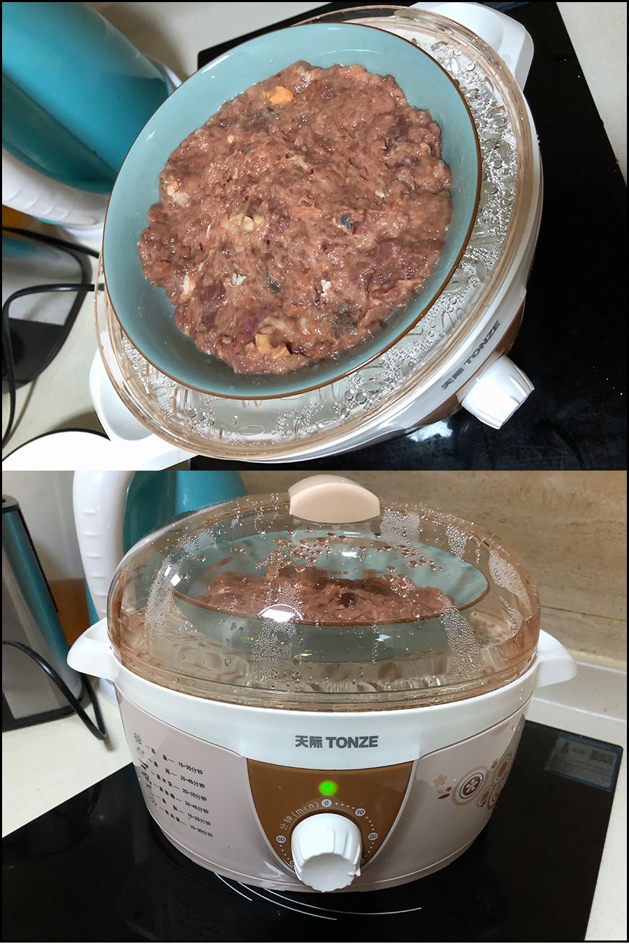 自制并不需要每天重复这些流程,(每天切肉也是够累),周末的时候利用一下午的时间把肉做好,然后分装放冰箱冷冻柜里,平常要喂的时候拿出来蒸一下就可以了。