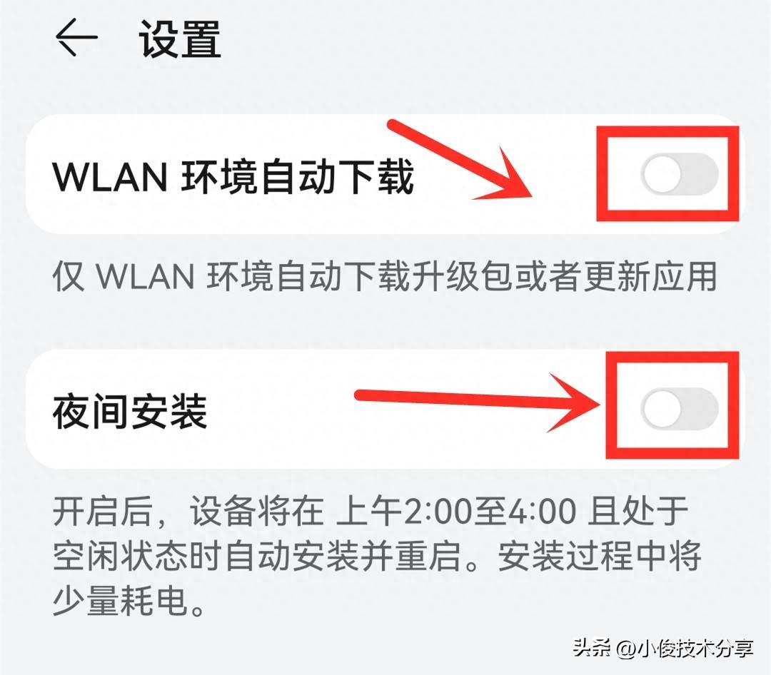 第三步,我们需要关闭手机系统更新和软件更新,我们打开手机系统设置,接着把WLAN下自动下载和夜间安装,这2个开关都关掉,如果说不关闭的话,手机就会在夜间和wifi环境下,自动帮你偷偷下载安装更新系统,如果说你的手机配置比较低,使用比较久,一旦更新了,就会出现各种各样的问题,比如说卡死,死机,黑屏,以及打开软件无缘无故闪退之类的,所以啊我们为了确保手机能够多用几年,一定要把它们关掉!