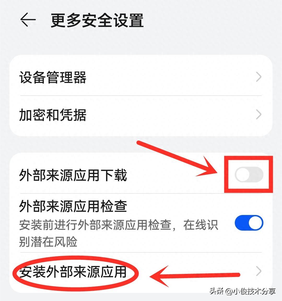 我们打开手机设置,接着往下滑动找到安全设置点击进去,然后在安全设置里面,我们选择下边的更多安全设置,在更多安全设置里面,就可以看到有一个外部来源应用下载的开关了,如果这个开关打开的户啊,那我们的手机就容易遭受到不明应用的攻击,非常不安全,以及会通过这些应用,自动和下载安装一些莫名其妙的应用,所以我们要把这个开关关掉,才能保护我们的手机安全!