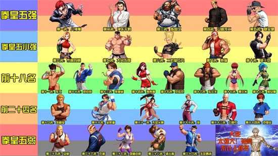第十五名:克拉克、第十六名:拉尔夫、第十七名:夏尔米、第十八名:莉安娜、第十九名:坂崎良、第二十名:金家潘、第二十一名:不知火舞、第二十二名:琼、第二十三名:七枷社、第二十四名:克里丝