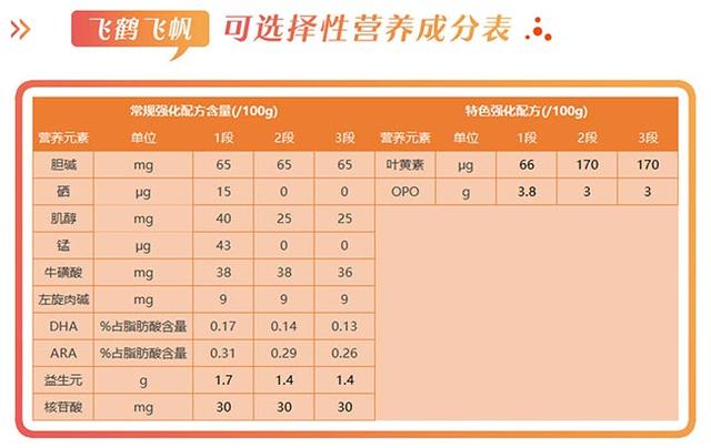 在营养与配方上,飞帆添加的基础营养配方严格遵守国家标准,小编在此就不多说,我们具体谈谈大家比较关心的可选择成分。飞帆一段添区别加12个可选择成分,包括10个常规强化勺配方配方和2个特色强化配方;二段和三段添加了10个可选择成分,包括8个常规强化配方和2个特色强化配方。
