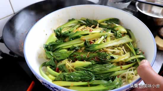 把青菜烫熟后捞入装豆芽的盆里面,铺在豆芽上面。