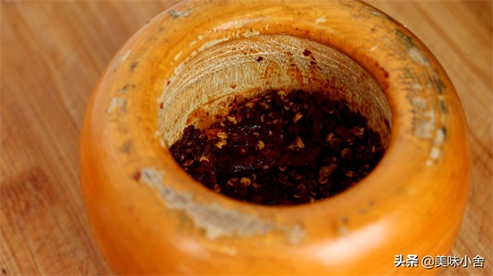 然后把之前捣碎的花椒和辣椒倒在肉片上,再放一些蒜沫和红辣椒面。把热好的油泼在蒜末、辣椒上面,激发出香辣味。最后撒些香菜就可以开吃了。