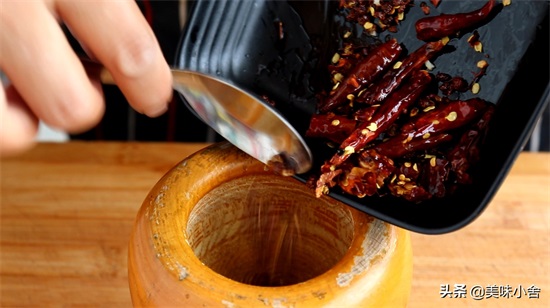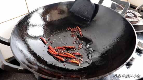 2、锅里倒入油,油热以后转小火。加入一些花椒进去,炒出花椒里的麻香味。然后再加入几个干辣椒进去炒香。把辣椒炒至棕红焦脆,炒出辣椒里的香辣味。再把花椒和辣椒控油捞出来晾凉备用。