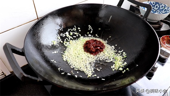 4、锅里重新倒入油,油热以后加入葱姜末炒香;再加入剁碎的豆瓣酱炒出红油。