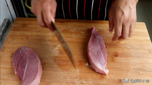 1、先准备一块洗干净的猪里脊肉,然后把里脊肉切成薄厚均匀的片。