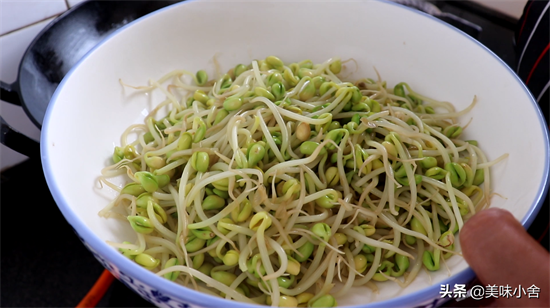 把黄豆芽炒熟后,盛入一个大点的盆里面垫底
