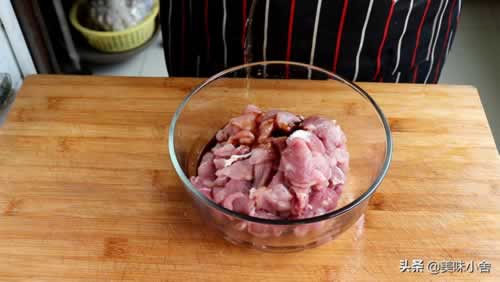 肉切好后放碗里,准备腌制。往里面加入一小勺的盐,加点生抽,再加点料酒去腥味。