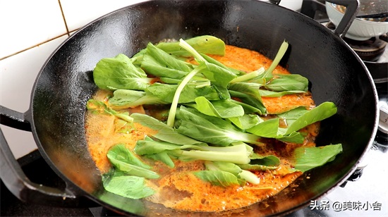 锅里汤汁煮开后加入一勺盐进去搅匀,然后加入青菜进去烫一下。