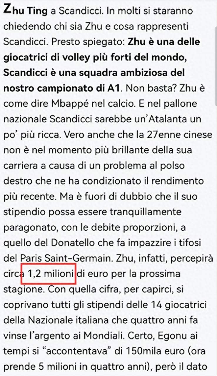 此前网传朱婷的年薪是100万欧元,如今根据《IL FOGLIO》的报道显示,朱婷的年薪是120万欧元,创造了意甲最高薪纪录。120万欧元这个数字比2018年世锦赛,意大利女排夺得银牌的全体球员的年薪加起来还要高,当时的埃格努年薪是15万欧元。同时从这点就也可以看出俱乐部管理层、佛罗伦萨公司的赞助人和赞助人保罗-诺琴蒂尼的宏图大志,他们希望在下个赛季大有作为。