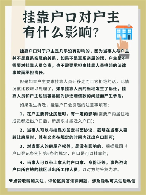 挂靠户口对于户主是几乎没有影响的,因为当事人与户主并不是直系亲属的关系,如果不是直系亲属的话,户主是不需要对挂靠人员负责,也不需要承担由挂靠人员挑起的法律事故而承担责任。
