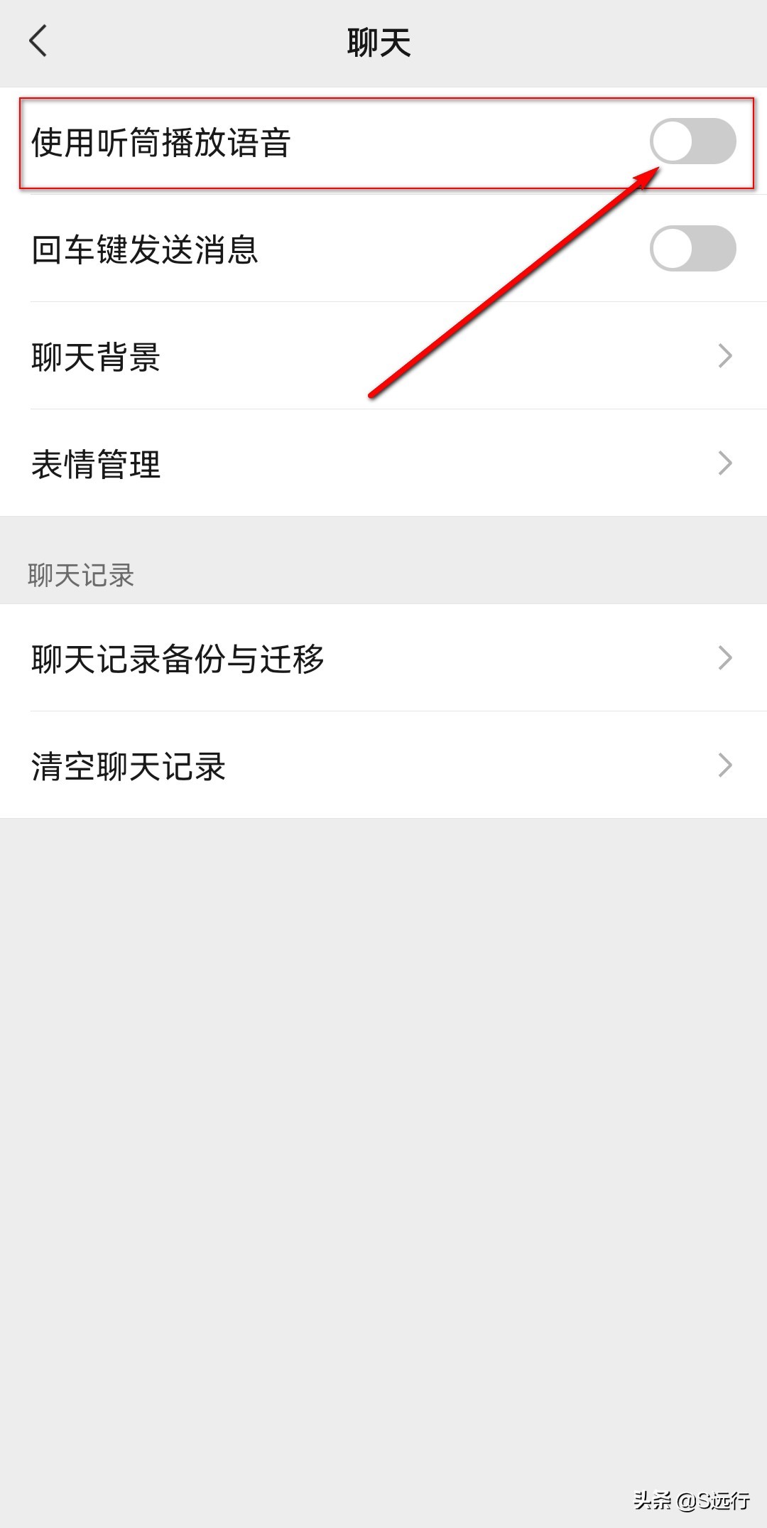 当“使用听筒播放语音”旁的小滑块处于点亮状态时此时在微信上就会显示一个耳朵,点击该小滑块。