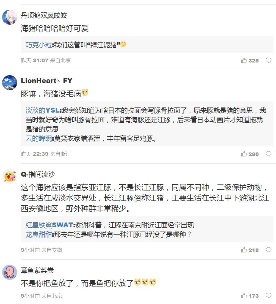有网友科普:这个海猪应该是东亚江豚,不是长江江豚,同属不同种,二级保护动物,多生活在咸淡水交界处。而长江江豚俗称江猪,主要生活在长江中下游湖北江西安徽地区,野外种群非常稀少。