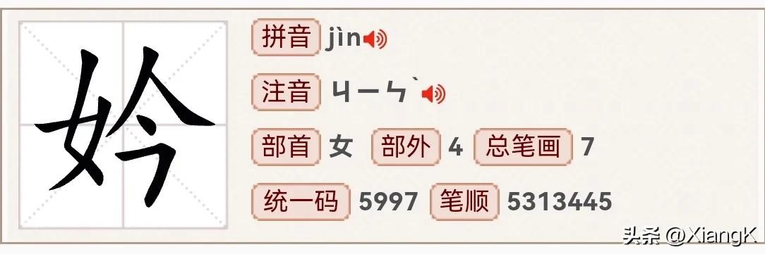 读音为“jìn”,同音字“进”,部首为“女”,总笔画7,左右结构。