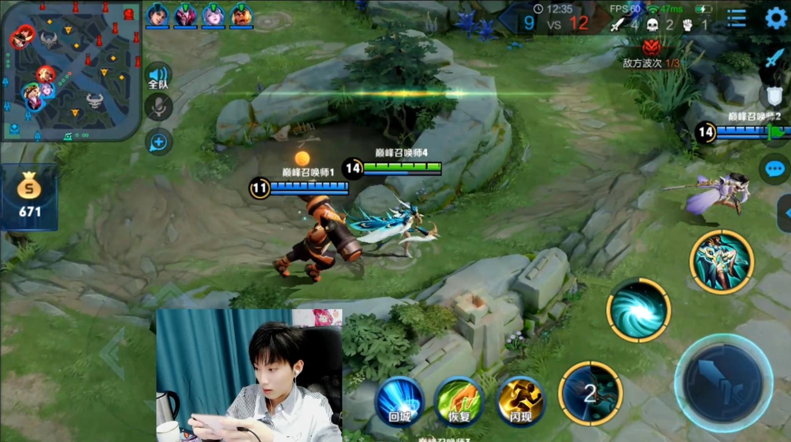 12分钟之后,红方就凭借这样消耗一波就撤退的打法,一直运营兵线,居然已经推塔了中路高地塔面前。如果不是巅峰赛,观众都以为这种配合是多排了。