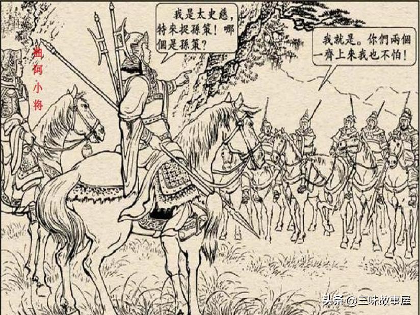 当时孙策带着程普等12人到神亭岭参拜光武庙,在打算窥探刘繇军营时被对方发现,刘繇部将太史慈认为这是生擒孙策的最佳良机,直接披挂上马,绰枪出营,临行前对众将说“有胆气者,都跟我来”,但是刘繇的手下慑于孙策的威名,都不敢出头,这时有一小将高声说到“太史慈真猛将也,吾可助之”,其余人的反应则是“众将皆笑”,而此人就是曲阿小将