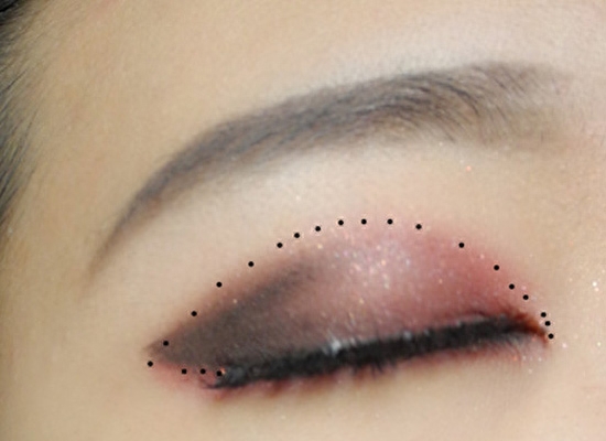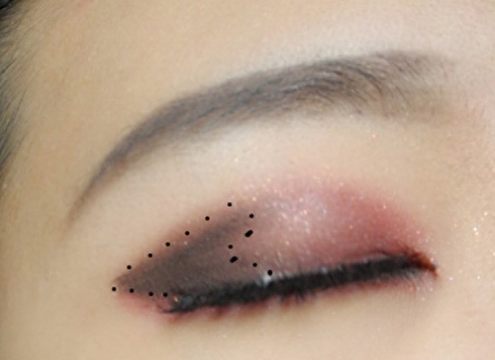 利用棕色系眼影在眼尾处扫成弧度。一定注意渐变。