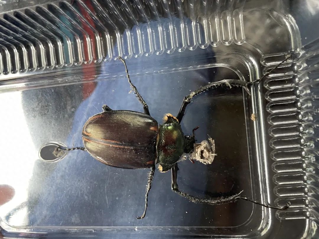 近日,浮梁县公安局森林分局接110转警称,湘湖镇一市民家中飞入一只大甲虫,民警接警后,发现这只大甲虫整体呈墨绿色,甲壳泛着金属光泽,前肢修长,疑似阳彩臂金龟,民警将大甲虫带回分局进行照料。