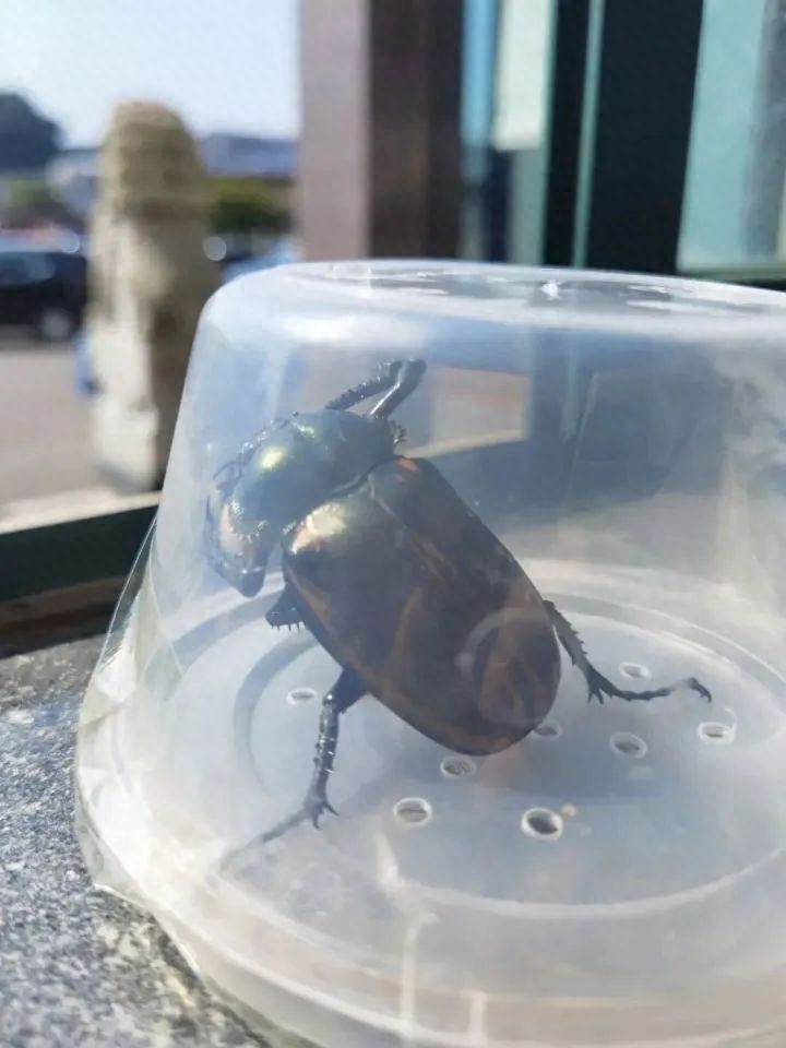 9月8日上午,民警第一时间联系了浮梁县野保中心工作人员,经现场鉴定,该只大甲虫系国家二级重点保护野生动物阳彩臂金龟,在确认其身体未受到伤害后,民警在野外将其放生。