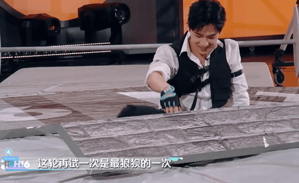 嘉宾要双手带着身体,在一大面墙来临之前,将自己折叠在上空有限的空间内。