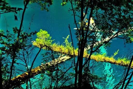 到了隆冬时节这里这里又是另外一番景色,百年枯树卧倒在水中被补水钙化,如同灿烂绽放的珊瑚,在阳光的照射下五光十色,非常迷人。