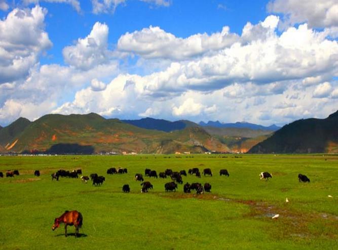 纳帕海植被资源丰富,高海拔和远离污染,让纳帕海成为了名副其实的高山植物园。纳帕海是云南白尾海雕的重要越冬地。在纳帕海就这样敬请飞舞吧。夏天水草丰满,草原上长着小花,羊、牛、马成群吃草,和草原融为一体。这一季,黑颈鹤、黄鸭、斑头雁云集于此,广阔空灵的草原上禽鸟纷飞,诗意盎然。从高处往下看,那些湖泊和水泡子宛如散落在草原上的颗颗明珠。绿色的草原上除了会增加一些水流,还会留下一些湖泊和众多的水泡子。我们两个仿佛无知少女,天真烂漫,在草原上狂奔,嬉闹,展开双臂去尽情拥抱大自然。