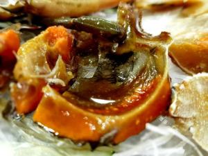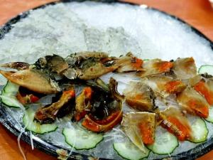从那刚才知道腌制大概的配料,在未吃前,珊珊三丫头能感觉生腌蟹是一种咸、鲜、微辣混合的海鲜美味。等了没多久,生腌蟹与鱼生虾生一齐被端了上来了。只见眼前的生腌蟹跟菜牌上的照片一样,蟹被斩件放在冰块上,经过腌制的蟹膏变成了枣红色的,珊珊三丫头夹起一块,放到嘴中试了一口,入口的那一刹那,凝胶似的蟹膏,啫喱般的蟹肉,鲜而不腥,清而不淡,十分可口。生腌蟹的做法,既能够保留了 “最原味”的蟹味,还有“最原味”的的蟹膏,吃着吃着,人也要醉了!虽然,珊珊三丫头的肠胃并不算太好,对“生”的海鲜不敢多吃。但面对着眼前的生腌蟹,却让我停不不了嘴了,真到把眼前的一大盘蟹都吃完了。
