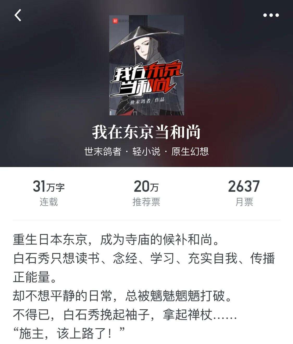 很好看的文,就是还比较幼。主角性格我很喜欢,天赋强上天不说了吧,还非常努力,心无杂物,在日本这种和尚只是个职业的国家,主角却表现得好像圣僧一样。然后主角非常强,大概相当于满级号到新手区,而且这个满级号还每分每秒都在快速成长。目前来看非常不错的文,