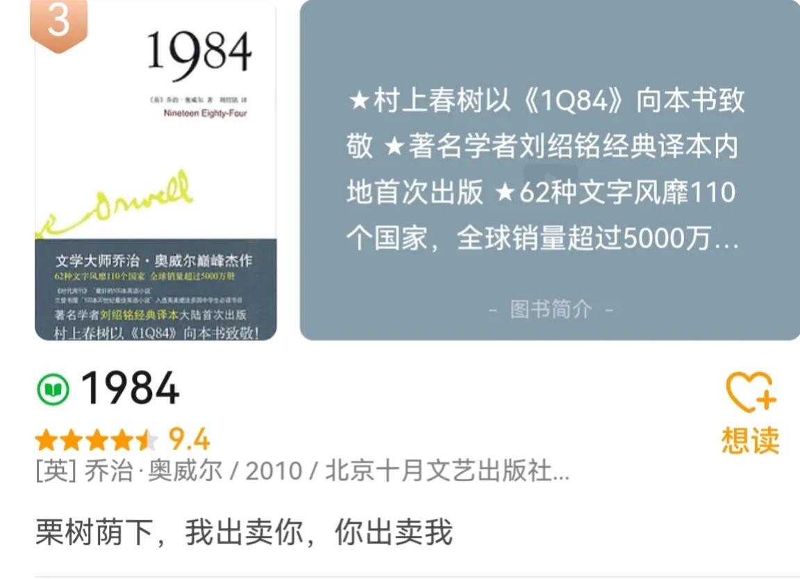 《1984》在很长一段期间都被列为禁书, “多一个人看《一九八四》,就多了一份自由的保障。”英国著名作家安东尼•伯吉斯如此说,这也是该书的现实意义。