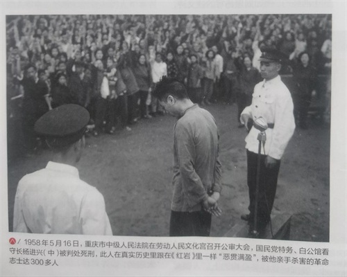 此人在真实历史里,是一“恶贯满盈”的刽子手。1946年,是他杀害了罗世文、车耀先等。1949年6月,又是他同另一特务一起杀害了杨虎城将军和他的儿子、幼女,以及杨虎城将军的秘书宋绮云夫妇。同年11月,杨进兴手提机枪指挥看守疯狂屠杀共产党人,在松林坡,他就亲手枪杀了32人。然而,他不像其他一些刽子手(陆景清)那样,畏罪逃去了台湾。重庆解放之后,杨进兴潜逃到四川南充,改名杨大发伪装成贫农隐藏了下来,最后露出了马脚。1955年6月,杨进兴被捕。1958年5月16日,杨进兴在他曾杀害无数革命志士的重庆公审后伏法。