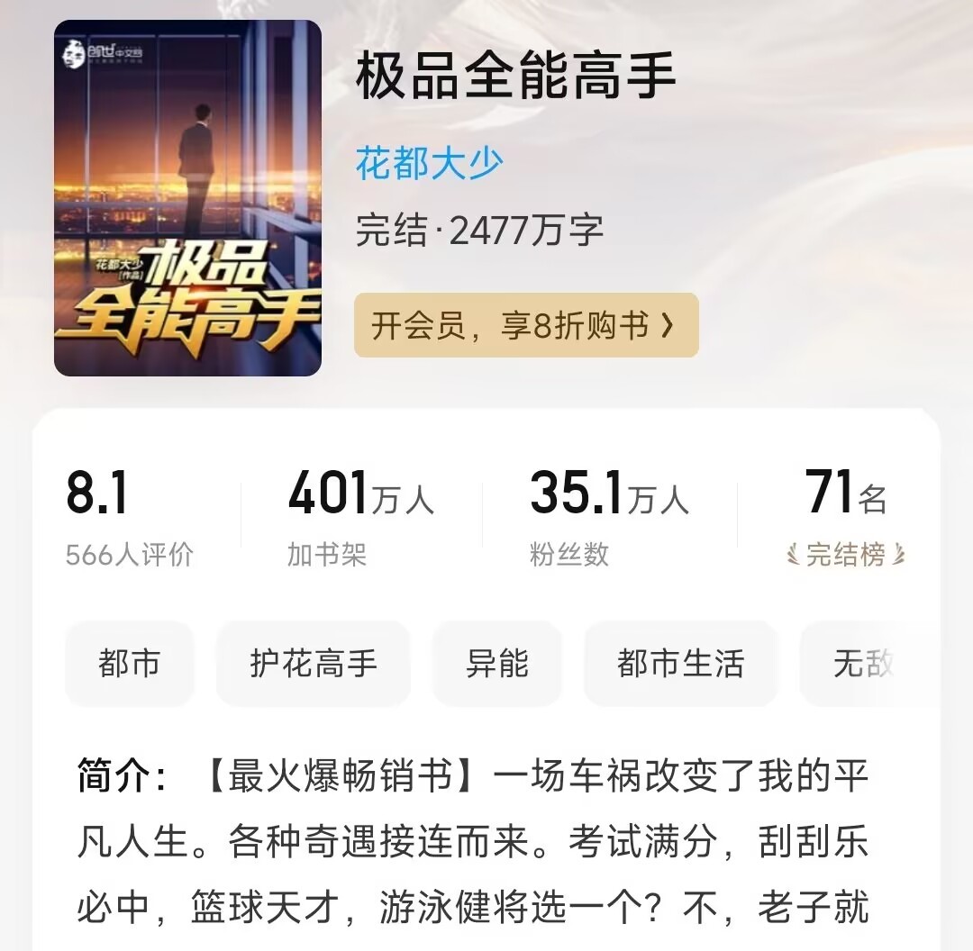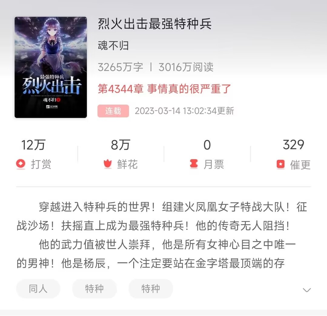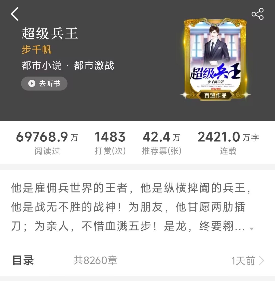16、17年那个时候爆火的一本书,在完结前一直占着QQ阅读的畅销榜第一。并且作者凭借着这一本书就实现了财富自由,签了大神约,这本书完结之后又写了一本兵王爽文,不出意外的扑街了。