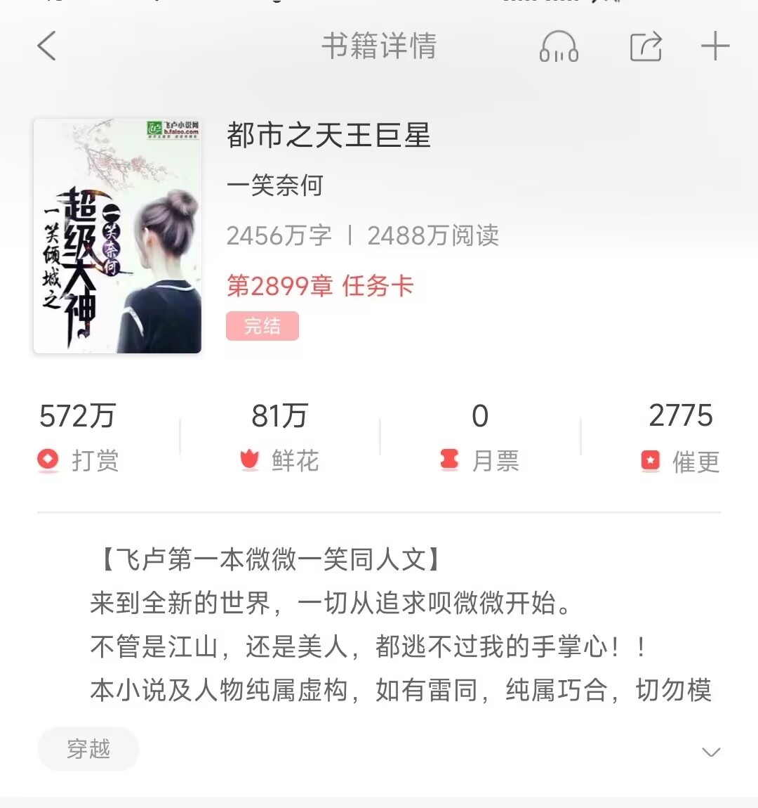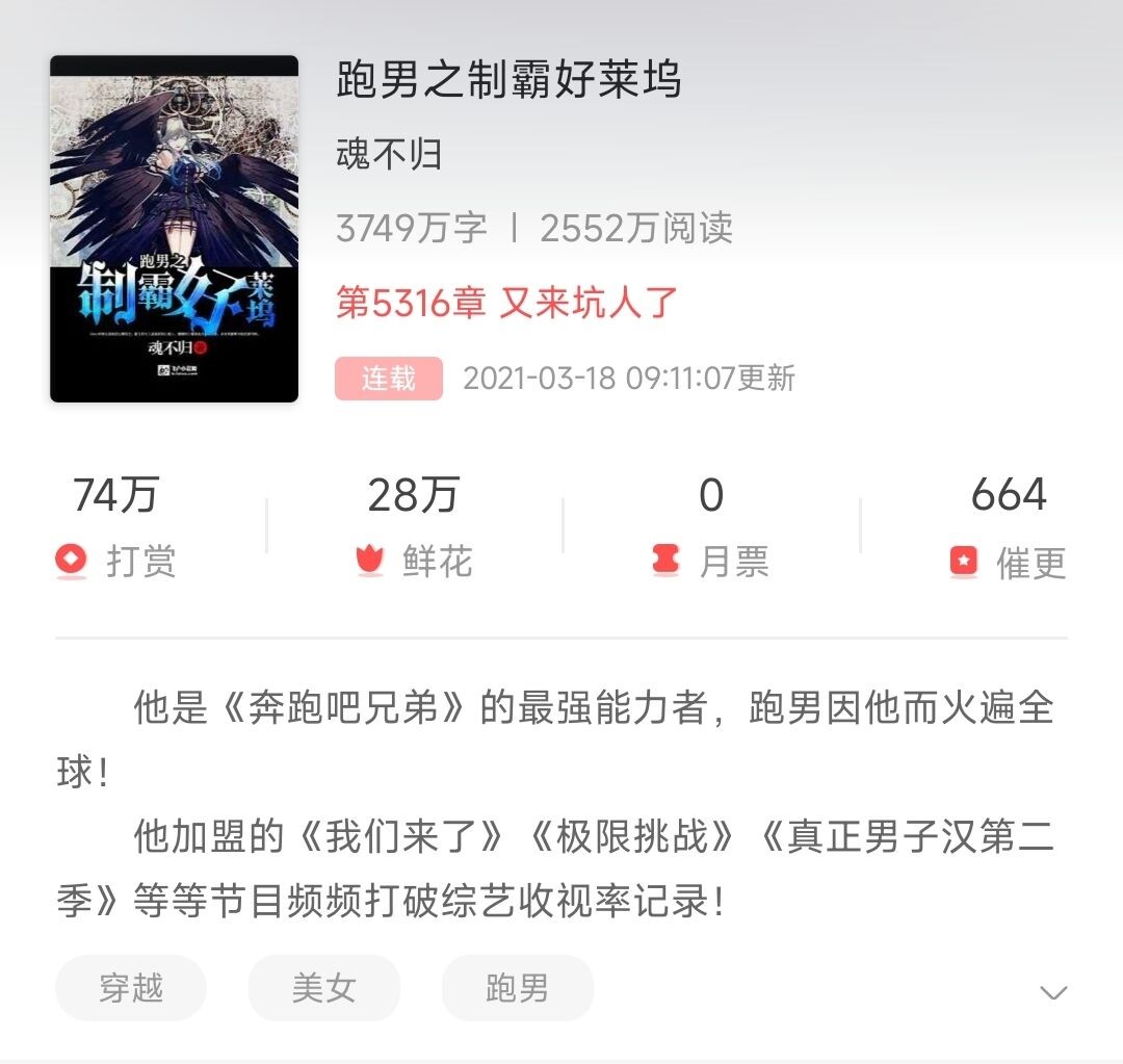 这书应该是内容被删改过一部分,去年我对这书的截图是2437.4万字,结果现在才2421万字,凭空少了十几万字,加上作者在这一年里的更新量,估计这本书被删了几十万字,现在作者也是挺摆烂的一个星期更新那么两千字,估计钱赚够人也懒了。