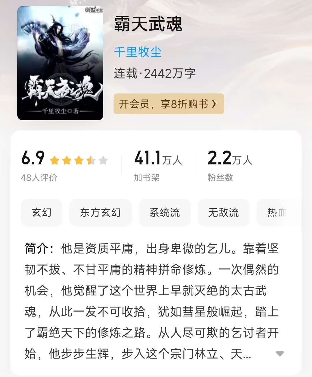 这书成绩也不算好,渠道也没出啥成绩。书呢就是那种传统玄幻文,功法武技玄幻流,中规中矩,就是对于武技的介绍特别多,主角还修练了一大堆武技,估计作者把前面的都忘了