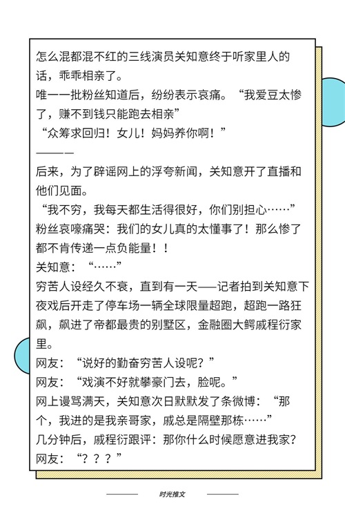 第二本是女主豪门千金,隐瞒身份闯荡娱乐圈成了十八线小透明,一次被父母催着去相亲被粉丝认出,后续被粉丝误认为女主太惨了,赚不到钱只能跑去相亲~~