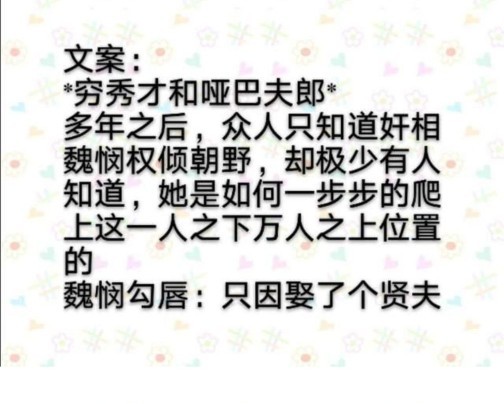 魏悯大方承认她是个夫管严,哪怕以后成了丞相也拒绝各种莺莺燕燕,心里只有她的阿阮。