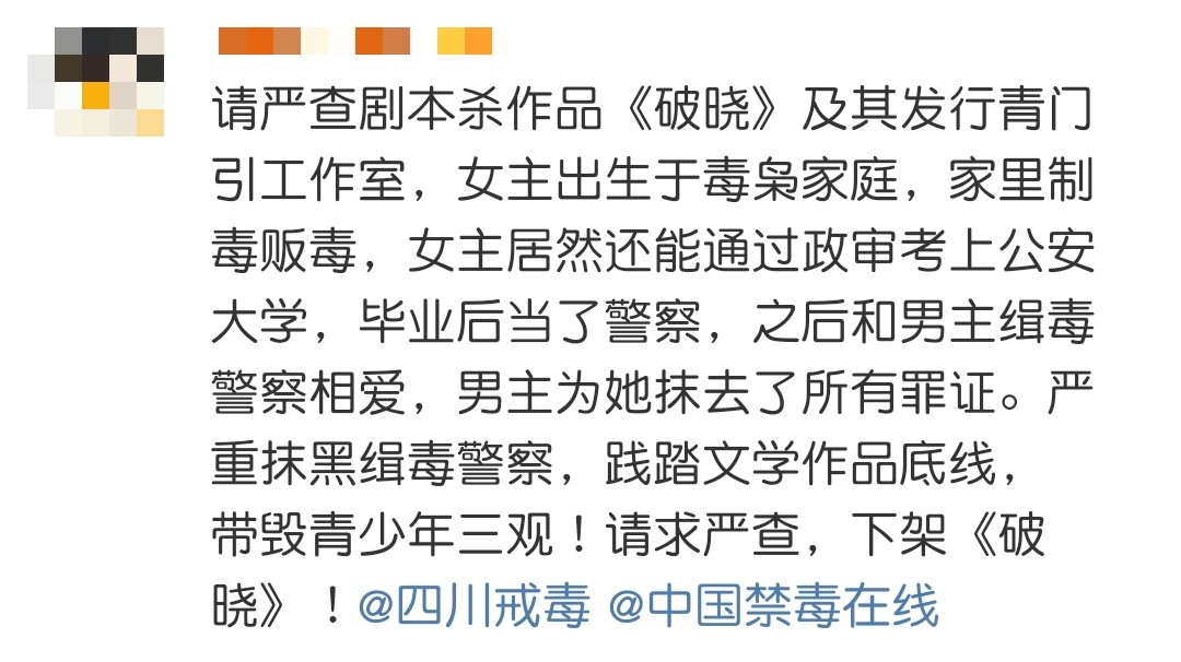遗憾的是,不止这一部小说有毒,网友发现剧本杀《破晓》也是和缉毒警察相关的作品。