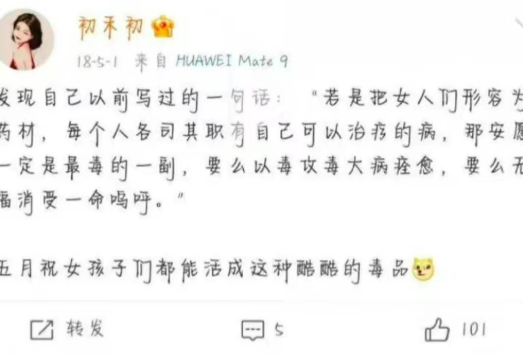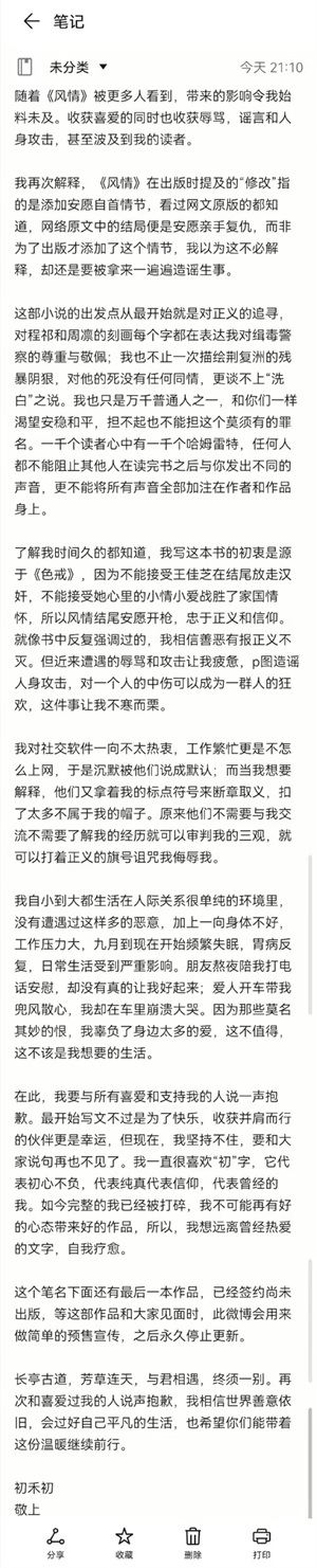 初禾初声称自己遭受了很多无端的指责和谩骂,P图造谣和人身攻击,这些事情让她不寒而栗。最后她表示自己的账号将永久停更,宣布退网。