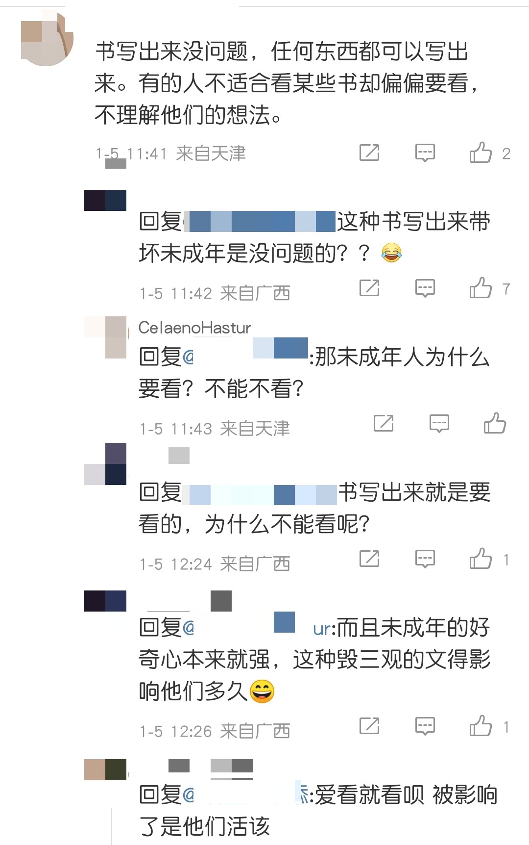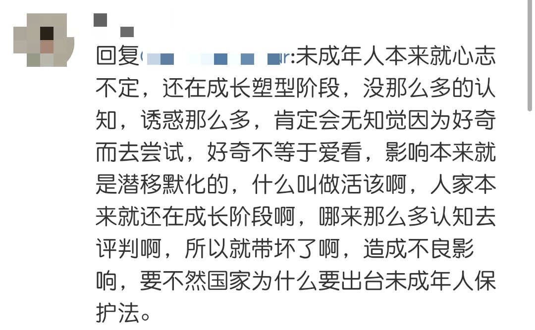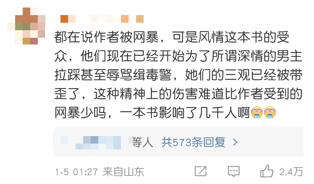 这条评论获得2.4万赞和近600条的回复 ,至少说明大多数读者还是有着清明的是非观。但是网络上不止是拥有正确而坚定的价值观的人,还有很多心智不定,三观未成的未成年人。面对诱惑、引导、未知的好奇很容易走入歧途。对于一个拥有众多粉丝,发布在开放平台上的作品,没有道德和法律的约束是非常可怕的。