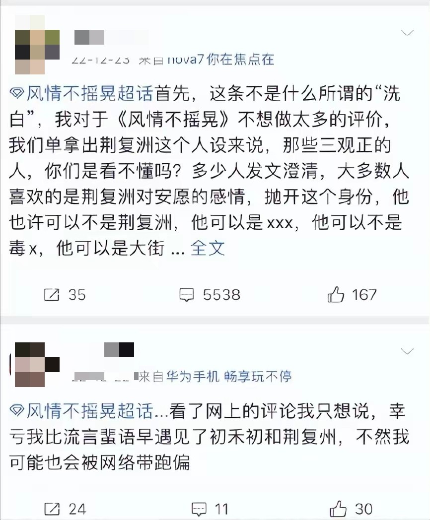 网络上支持作者弘扬爱情的大有人在,更可怕的是,这本小说还有超话。不知道是怎样一群人拥有着怎样的三观聚在了一起。书粉留言自称“三观不正,就喜欢荆复洲爱安愿,就希望他们白头偕老”,“荆复洲有罪,可他的爱无罪”,甚至有人歌颂毒枭的爱情,发布诋毁缉毒警察的不当言论。